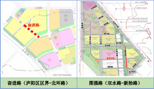 該項目擬建道路奮進路(廬陽區區界-北環路)紅線18米,全長222米,為城市支路;規劃七路(圖強路)(雙水路-新抬路)紅線15米,全長423米,為城市支路。該工程建設主要內容為道路、排水、照明、交通、綠化、管線綜合及其他配套附屬設施等,為完善城市功能、改善民生福祉、服務區域生態環境可持續發展提供保障。